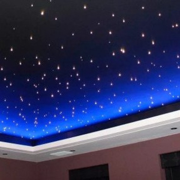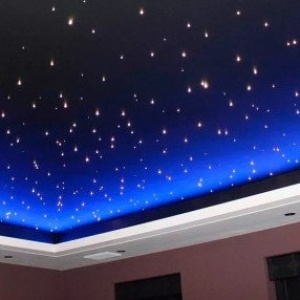 Существует вариант, когда оптические волокна не протягивают через потолочное полотно, а все элементы находятся во внутренней части натяжного потолка. В этом случае, к концам нитей монтируются светодиоды, которые просвечиваются через полотно и создают спецэффект, похожий на мерцание далёких звёзд.