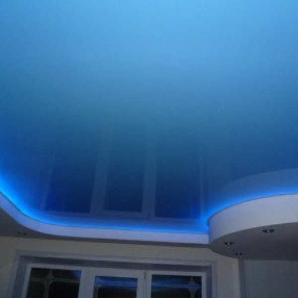 Преимущества потолка с подсветкой. Гибкие самоклеящиеся ленты с диодами появились сравнительно недавно, но сегодня переоценить их использование в конструкциях натяжных потолков очень сложно. Основными преимуществами, делающими светодиодную подсветку на потолке столь популярной, являются следующие. Светодиодная лента потребляет немного электроэнергии, так как в её работе применяется низковольтное напряжение. Практически не нагреваясь, она имеет высокий уровень пожароопасности. Лента компактная, гибкая, легко монтируемая, с регулировкой яркости. Не выделяет вредного для человека излучения и имеет значительный срок эксплуатации (около 10 лет).
